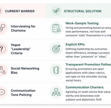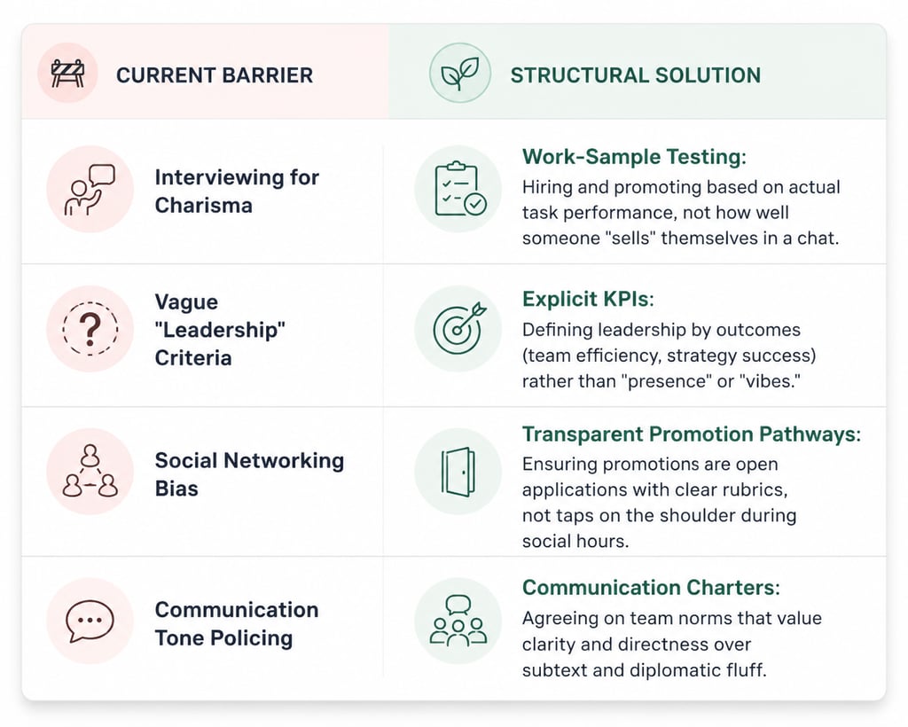 Leadership roles are frequently gated behind "soft skills," which are defined exclusively through a neurotypical lens. Managers expect leaders to communicate using subtext, indirect requests, and diplomatic ambiguity. Just as my teachers misread my directness as insubordination, colleagues misread autistic clarity as aggression or rudeness. We often receive feedback solely on how we communicate (tone, eye contact, bluntness) rather than the content or value of our ideas, stalling our growth in a cycle of "remedial" soft-skills training that forces us to mask rather than lead.