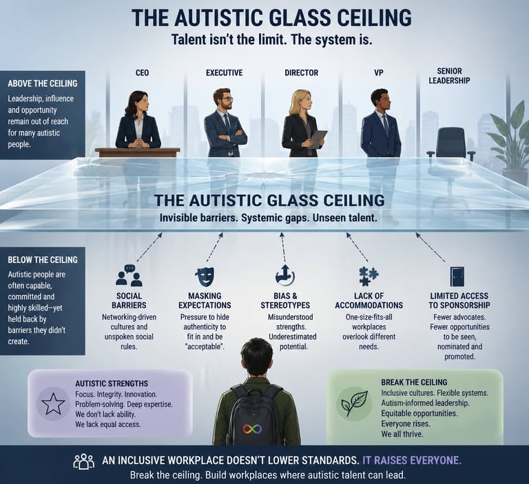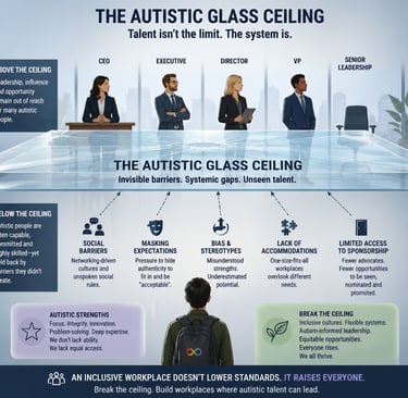 This "Autistic Glass Ceiling" is a sociological and professional phenomenon where autistic individuals, despite possessing high technical competence, superior pattern recognition, and specialised skills, are systematically prevented from advancing to leadership or senior roles. Unlike the traditional glass ceiling—which relies on overt demographic biases like gender or race—ours is built on neuro-normative standards of behaviour, communication, and social dominance.