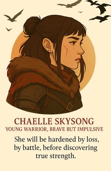 Her story is not one of perfection or purity, but persistence. Chaelle Skysong stands for every person who has fallen, bled, and still dared to rise again. She will be hardened by loss, by battle, before discovering true strength.